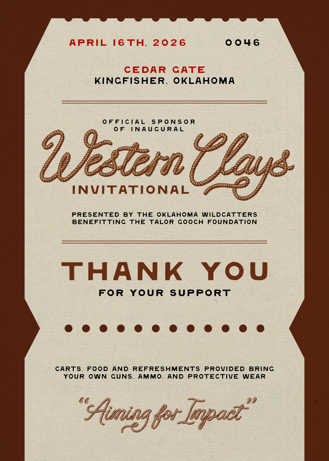 Join us at the Western Clays Invitational on April 16, 2026 at Cedar Gate in Kingfisher, Oklahoma, a sporting clay tournament hosted by the Oklahoma Wildcatters in support of the Talor Gooch Foundation. This event brings together community leaders, partners, and supporters for a day of competition, connection, and giving back.